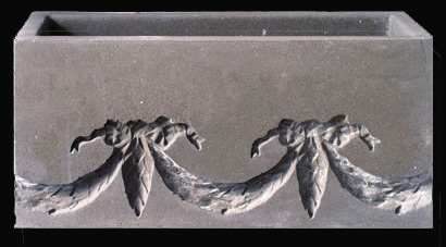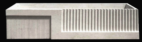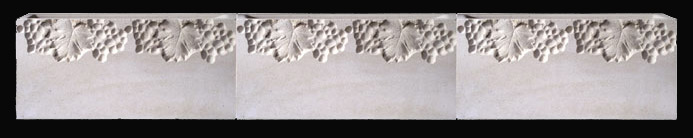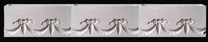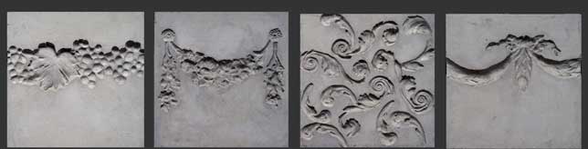 These designs retain the flat surfaces of the modernist collection, but introduce indented 'baroque' elements such as the voluptuous swag and drop, curls and fruit and garland details found in 18th century sculpted facades. |