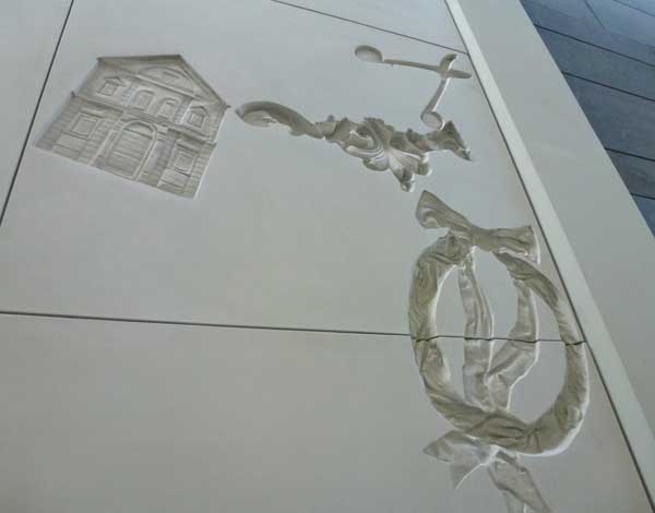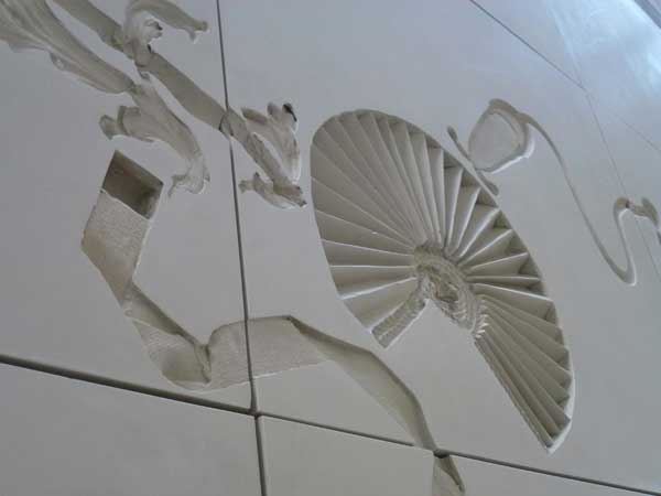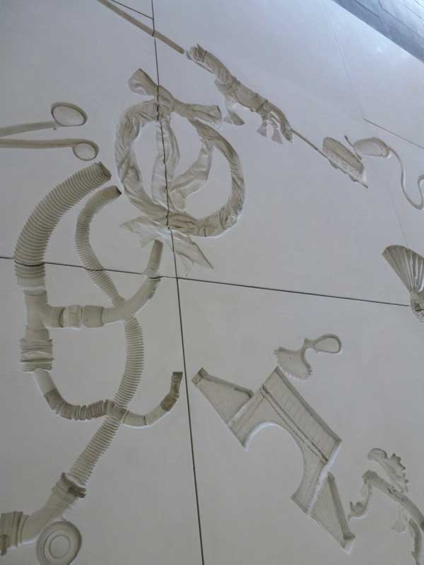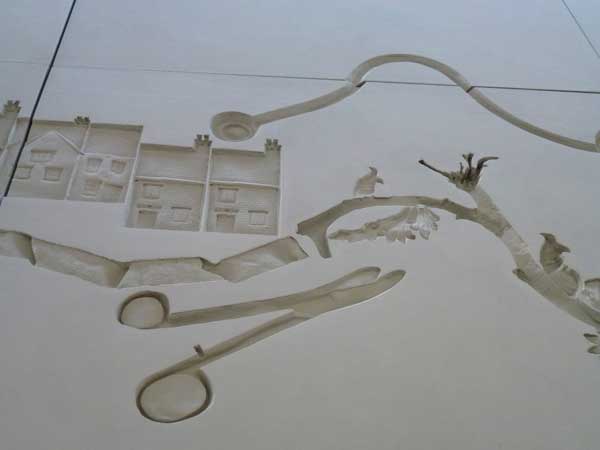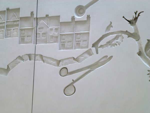 the sculpture The Cynon Valley Hospital was built to replace two old hospitals at neighbouring villages Mountain Ash and Aberdare. The brief was to reference the history and people of this South Wales valley along with the original hospital buildings and the activities carried out by hospital staff. The sculpture consists of 3 plaster reliefs with motifs indented to the surface. The imagery is made by direct casting from real life objects and materials. The motifs I created relate to the following: - architecture of the valley, terraced houses, chapels, pubs - bridges on the river Cynon - music + jazz bands of which there was a strong tradition in the valley - referenced by musical instruments and details from the band costumes - mining - symbolized by pit ponies & breathing apparatus (the pits closed in the 1980s) - interior architectural details from the old hospitals - the cenotaphs in both villages - ledgers in the old hospitals which recorded donations from patrons and miners towards the running of the hospitals before the National Health Service was established - medical equipment, including various types of scissors, saws & pliers used in the plaster cast department I cast directly from real objects and when necessary enlarged these initial casts with a special mould-making technology which allows exactly proportioned expansion of the original object. I also supplied silhouette versions of some motifs for the etched glass panels on the staircase and balcony |