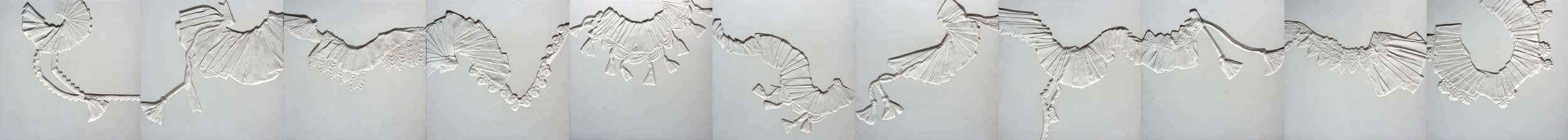 Cast directly from fabric, braid and lace, the frieze references the Elizabethan ruff. |