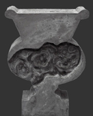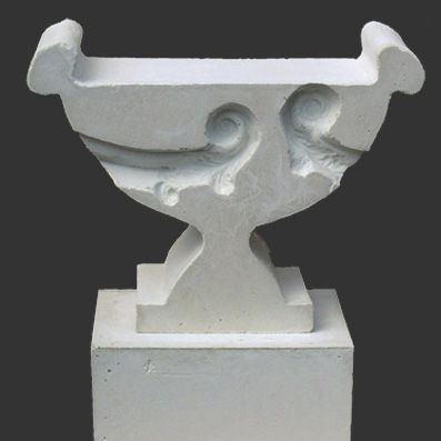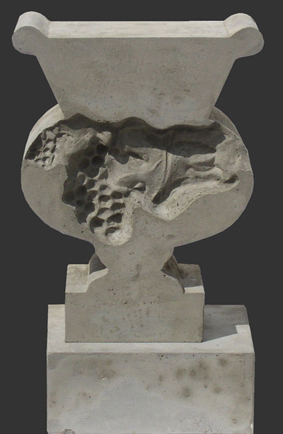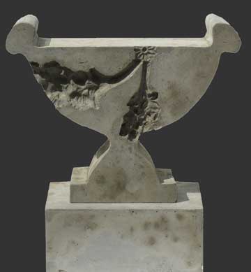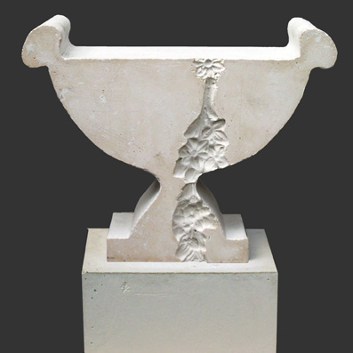 The urn sculptures are a contemporary re-invention of the classical urn-on-plinth. Instead of traditional stonework, the flattened forms are cast in industrial grey or white concrete giving the sculptures an edgy, modern twist. The surface imagery has architectural references - particularly the voluptuous garlands and swag and drop detail of 18th century facades which, instead of being sculpted, are indented on a perfectly flat surface. Uniting baroque-style decoration with hardcore concrete creates an interesting and ironic juxtaposition.